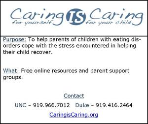 As the case of Marie Caro shows, parents need additional support just as much as the affected child in fighting this disease. UNC Eating Disorders Program and the Duke Center for Eating Disorders believe parental support is incredibly important throughout the treatment of a child’s illness. Along with UNC’s Interdisciplinary Health Communication Program, these programs have created a communication-based project –“Caring for Yourself is Caring for Your Child” – to address this very issue. This project united the UNC School of Journalism with UNC and Duke researchers and clinicians to compile top-of-the-line resources and evidence-informed information and support specifically for parents of children with eating disorders. The project aims to help parents practice self-care, defined as taking the time to engage in activities that decrease stress and facilitate relaxation.