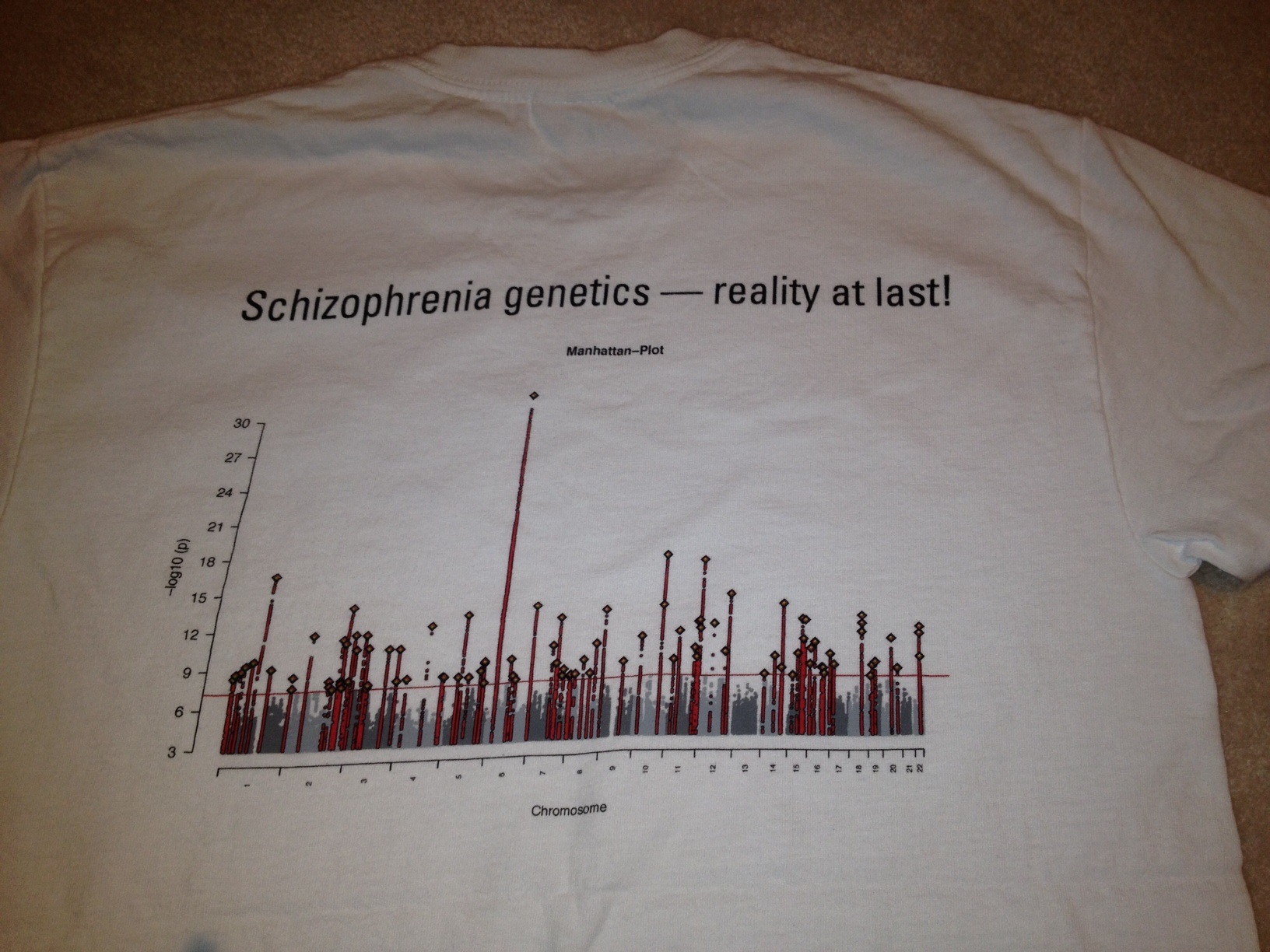 Heck, they even have a t-shirt! This is the t-shirt that the schizophrenia group had printed in celebration of identifying over 100 genetic “hits” for schizophrenia. These researchers are dedicated psychiatrists, geneticists, and statisticians who are finally seeing the light at the end of the tunnel, in many cases after decades of working in the field. Their perseverance and determination to understand the illness is finally paying off and they, frankly, they are excited. What this means is that scientists can now begin combing through those hits to understand their biology and the pathways that lead to the symptoms that characterize schizophrenia. Even more essentially, this knowledge will then be transformed into the development of novel therapeutics that will directly target the biology of the disorder and help millions of people worldwide.