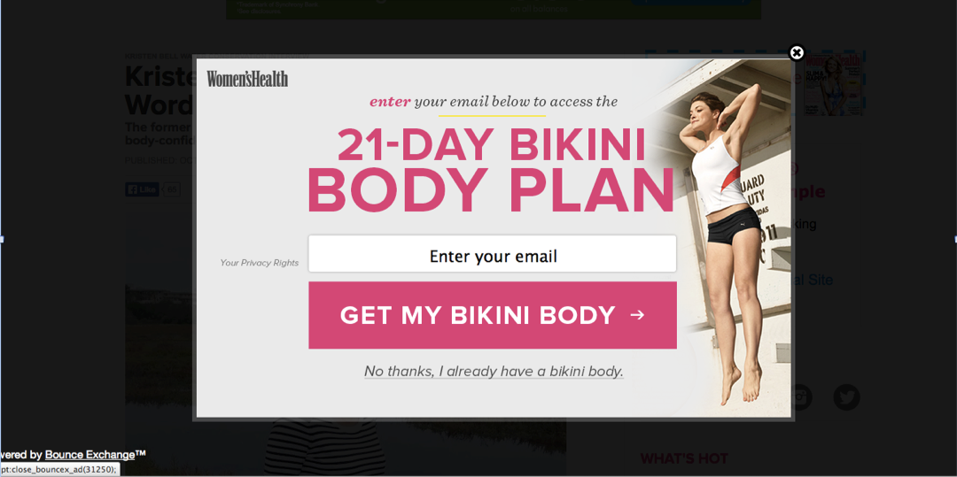 [Postscript: Incidentally, while I was looking at the article with Kristen Bell’s interview an advertisement for a “21-Day Bikini Body Plan” popped up (see screen shot below). There was an option to click on “No thanks, I already have a bikini body.” Unfortunately, there was no option to click on “I don’t care about having a bikini body and don’t consider that to be a part of my health.”]