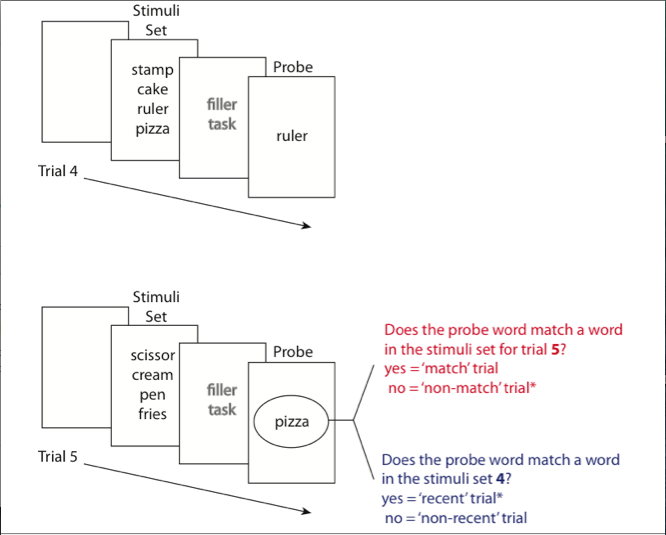 Trials could be classified as a “match” trial, in which the probe word appeared in the stimuli set for that trial, or a “non-match” trial, in which the probe word did not appear in the stimuli set for that trial. Trials could also be classified as a “recent” trial, in which the probe word appeared in the stimuli set for the previous trial, or a “non-recent” trial, in which the probe word did not appear in the stimuli set for the previous trial. In the figure shown below, Trial 5 is a non-match/recent trial. The probe word for Trial 5 (pizza) does not appear in the stimuli set for Trial 5 (scissors/cream/pen/fries), making Trial 5 a non-match trial. However, the probe word for Trial 5 (pizza) does appear in the stimuli set for the previous trial, Trial 4 (stamp/cake/ruler/pizza), making Trial 5 a recent trial. These non-match/recent trials might tempt the participant to incorrectly respond that the probe word did appear in the stimuli set for that trial, because they were remembering the word from the stimuli set in the previous trial. As a result, these non-match/recent trials were a bit complicated. Researchers compared how participants did on these difficult non-match/recent trials to how they did on the simpler non-match/non-recent trials, where it was easier to respond, correctly, that the probe word was not in the stimuli set because it hadn’t appeared recently (in at least the past 5 trials).