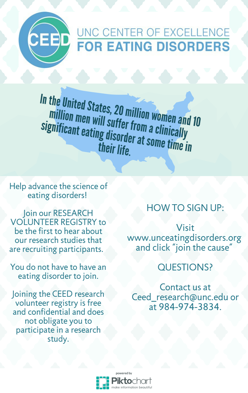 To conduct these research studies, we need help from volunteers like you – individuals who want to help us better understand eating disorders. You can help by volunteering to join our research registry. Anyone can join our registry. We welcome volunteers with no history of an eating disorder, as well as volunteers with a current or past history of an eating disorder.