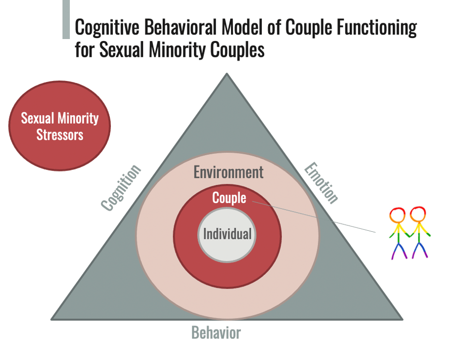 Individuals and couples who have sexual minority orientations may experience a variety of stressors stemming from negative societal attitudes and conditions towards sexual minority individuals and couples. Sexual minorities, people who experience romantic and/or sexual attraction to same-gender or gender-diverse others, experience a wide range of stressors, including discrimination and violence, prejudice, and internalized negative attitudes about themselves. Meyer (2003) gave a name to these collections of experiences: sexual minority stress. There are two main categories of stressors: distal stressors, which are objective events and conditions in one’s environment (for example, prejudice events such as discrimination and violence, or structural inequalities such as limits on same-sex marriage). Proximal stressors, on the other hand, develop through one’s own perceptions and appraisals of distal stressors, leading to psychological impacts that are internalized by the individual or couple. These proximal, psychological stressors include expectations of rejection, concealment of identity, and internalized homonegativity. Experiences of sexual minority stress may influence a couple’s well-being by way of three domains from an ecological perspective: (a) the individuals who make up the relationship, (b) how the two partners interact as a couple, and (c) their environment and how the couple exists in a broader community (Baucom et al., 2020). Risk and protective factors that determine the qualities of one’s relationship exist on all three levels. At the individual level, what each partner brings into the relationship (e.g., mental health concerns, specific sexual orientation) might influence the other partner’s well-being and the couple’s well-being in a variety of ways. At the couple level, different interaction patterns and relational qualities between the two partners (e.g., communication quality, level of intimacy, conflict as a result of discrepant sexual orientations) and their effects on the couple can be examined. Further, individual and relationship functioning are inextricably tied such that they influence one another (Baucom et al., 2020).
