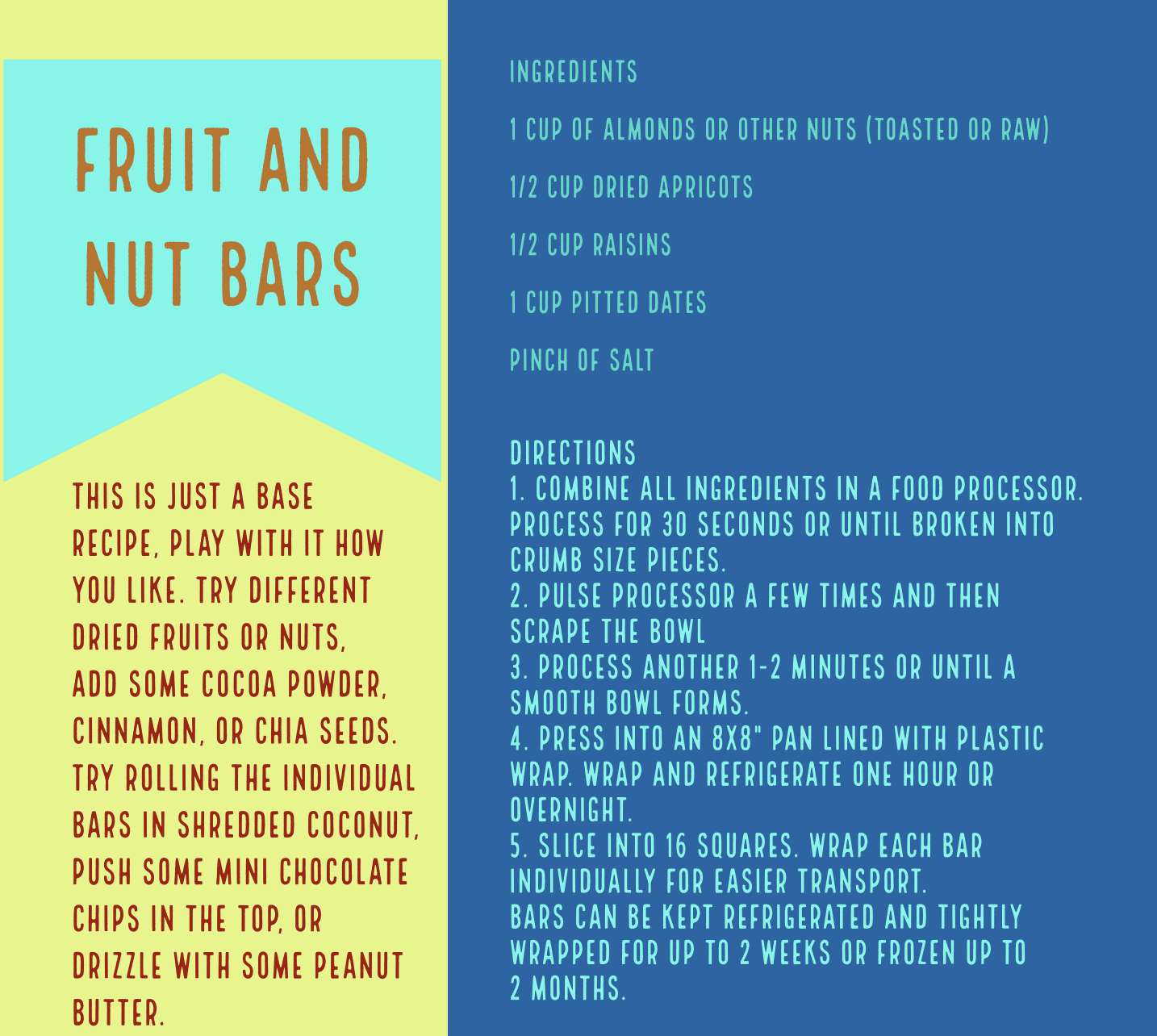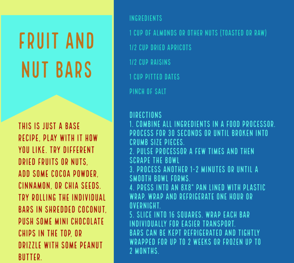 So, what to do with dried fruit? You can just eat it as is or mix it up with some nuts to make a trail mix. You could have some dried fruit with some cheese and call it a charcuterie board if you’re feeling fancy. You can throw dried fruit in your morning cereal, hot or cold, or on top of a salad. There are a ton of recipes to make cakes and cookies with raisins and dates, my family’s current favorite is sticky toffee pudding. Chopped apricots, figs, or dates are often found in savory dishes too, especially in recipes from North Africa. I often make these fruit bars to keep on hand for a quick easy snack. Once made, they can be kept wrapped in the fridge for up to two weeks. This is the base recipe, but you can easily play around with it. Try different fruits or nuts, add some cocoa powder, cinnamon, or chia seeds, and try rolling the individual bars in shredded coconut or drizzling your bars with peanut butter.