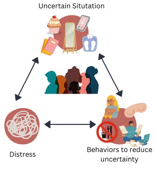Recently, it has become clear that intolerance of uncertainty may also play a role in other conditions such as depression and eating disorders. Imagine someone with an eating disorder who has trouble tolerating uncertainty going to a restaurant and not knowing what is going to be on the menu, or having to step on the scale at a therapy appointment. These can be highly anxiety-provoking and even threatening experiences for someone with an eating disorder. Framing these experiences as intolerance of uncertainty can help loved ones and clinicians understand the distress and respond better to help during the recovery process.